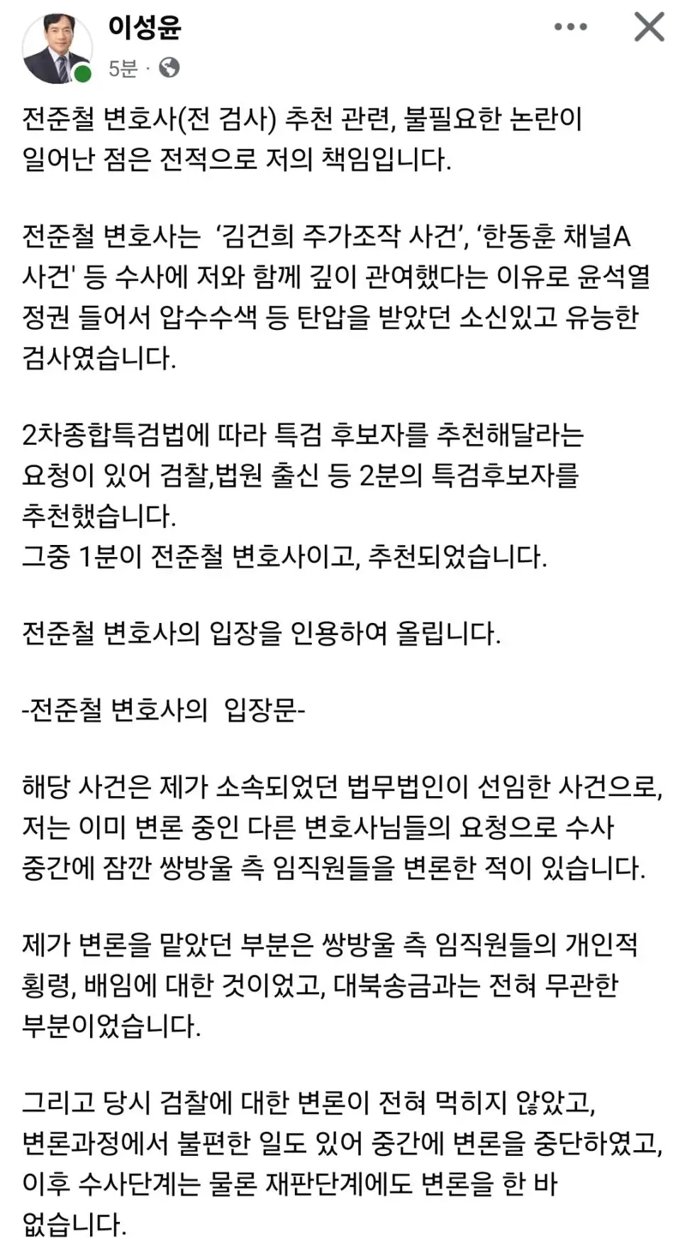 이성윤 의원 입장문