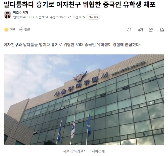 말다툼하다 흉기로 여자친구 위협한 중국인 유학생 체포 욕망의덫 0 8 0 0 2시간전 주소복사 복사되었습니다! 말다툼하다 흉기로 여자친구 위협한 중국인 유학생 체포 말다툼하다 흉기로 여자친구 위협한 중국인 유학생 체포 0 0