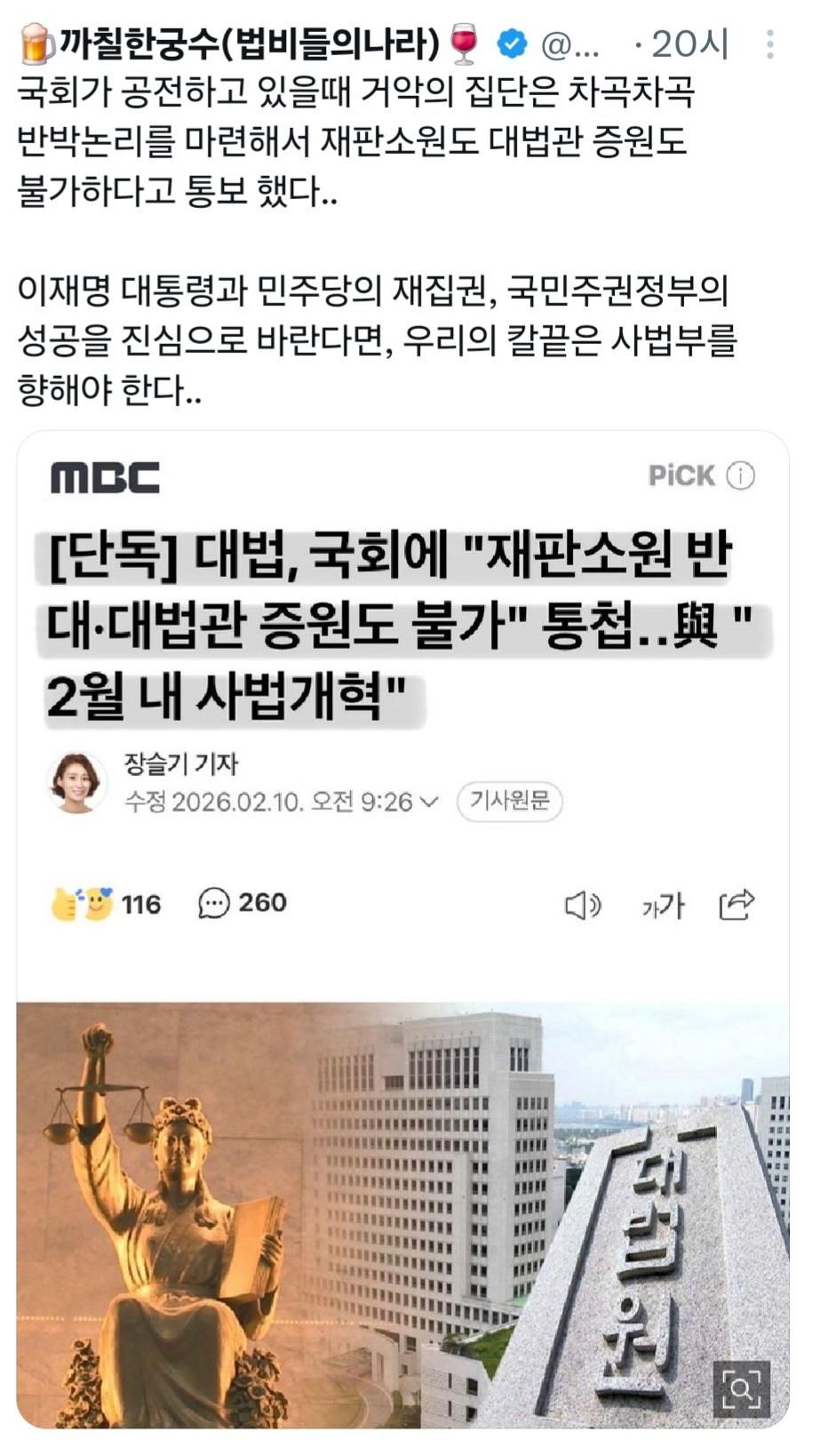 조희대 사법부, 국회에 사법개혁 불가 통첩