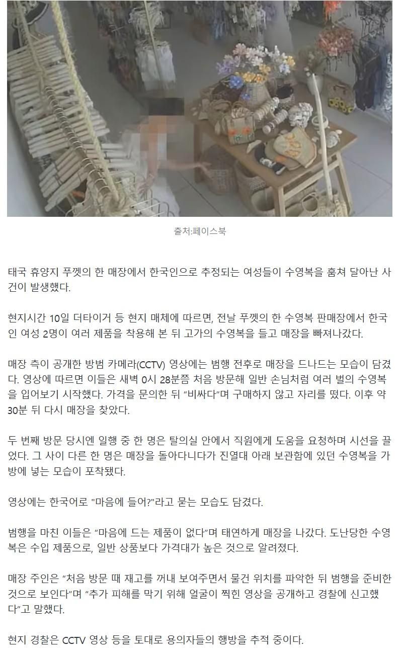 태국 푸껫서 수영복 훔친 한국 여성들…매장 주인 CCTV 공개
