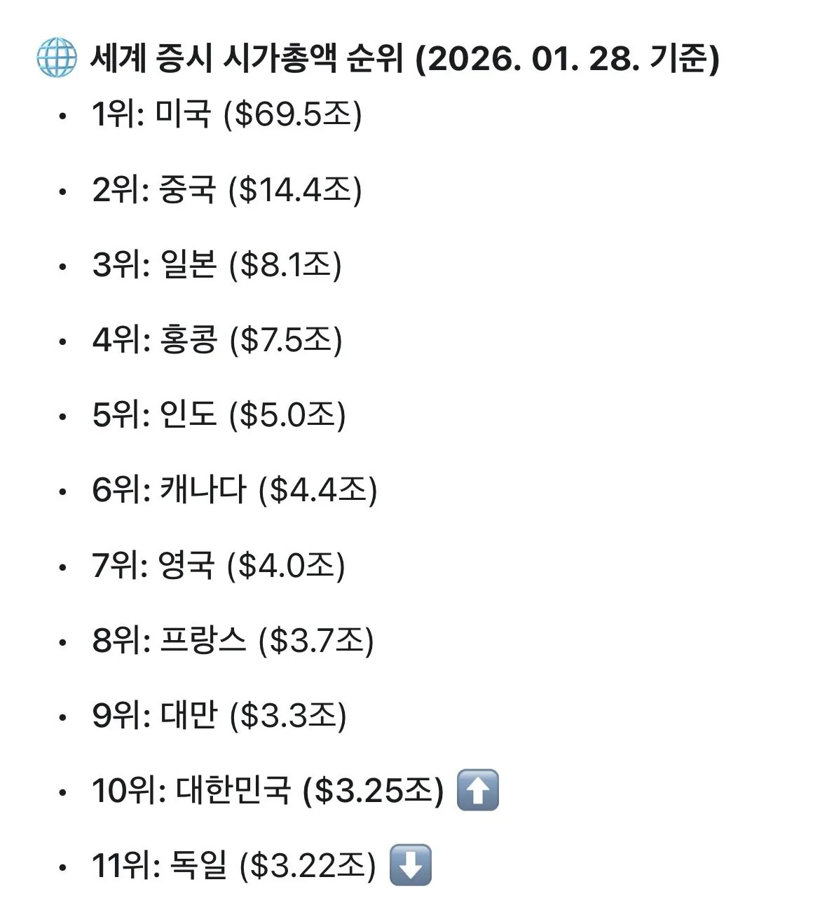 한국 증시 시가총액 세계 10위 등극, 독일 역전 진격의포터 0 1 0 0 3시간전 주소복사 복사되었습니다! 독일 역전하고 세계 10위등극, TSMC로 급성장한 대만 밑바닥까지 추격중, 추세를 보면 9위까지는 갈것으로 보여짐. 1년만에 급상승함. 중국 영토인 홍콩을 합산할 경우 세계 9위 0 0